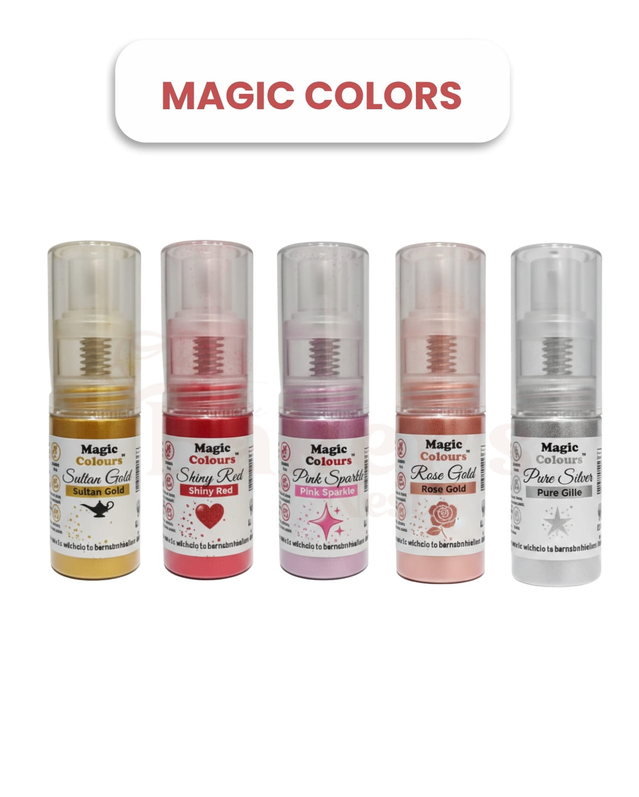 Magic Color Lustre Dust 10ml adds a stunning metallic and sparkling finish to cakes and desserts. Available in Sultan Gold, Shiny Red, Pink Sparkle, Rose Gold, and Pure Silver, these premium food-grade dusts deliver rich shine and smooth coverage. Perfect for enhancing fondant, chocolates, sugar flowers, and celebration cakes with a luxurious professional touch.